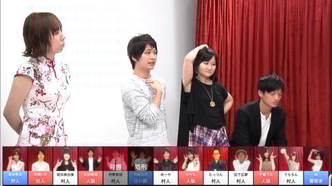 その後田下が自分の結果は占い師と一斉が良いと言ったので、永田さんと田下の結果を一斉に言うところで、結さんが同時に霊媒師としてカミングアウト、花崎さんの結果は村人だったと言います。永田さんの結果はてらちんさんが村人、田下は結果を出さず、霊媒師撤回です。