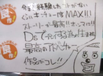 ちなみに、写真右側下の良作マークがついたPOPは、僕の文章を、このサイトやAllAboutゲーム業界ニュースのイラストを描いてもらっている橋本モチチさんに手描きでPOPにしてもらったものです。こちらはPDFでお店に配布し、各店舗で印刷して使ってもらっています。