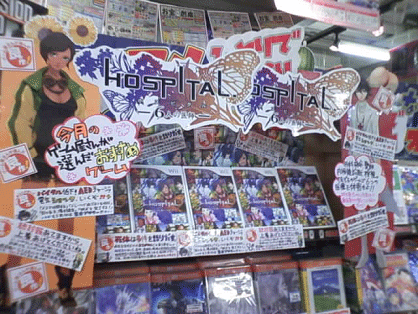 お宝創庫阿久比店 今まで紹介した写真と比べると、巨大コーナーというわけではありませんが、スゴクよくまとまってます。両側にあるお手製の手描きPOPが効いてますね。ホスピタルのロゴがアーチのような感じになっていますが、実はホスピタルというゲームにおいて、ロゴは結構重要な意味を持っていたりします。