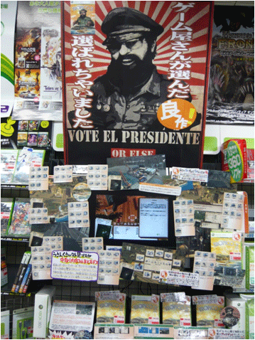 メディオ!西市 トロピコ3はとにかくゲームが複雑、かつ、日本で売れてる似たゲームが無いので、中身の説明が難しいんですね。シムシティが近いですけど、やっぱり違う。で、このお店は、でっかいトロピコおじさんのポスターでインパクトをつけつつ、細かくゲーム中に使うアイコンなんかも印刷して、どういうゲームか伝えようと頑張ってます。ゲームに対する理解が高くないと作れないコーナーです。