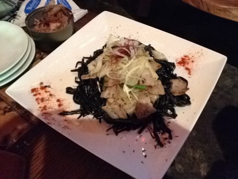 真ん中の具材でちょっと分かりにくいんですが、麺が全部真っ黒です。で、何かというとイカスミでした。これはまた美味しかったですね、イカスミ焼きそば。濃厚です。イカスミパスタよろしく、口が真っ黒になりますけどね。