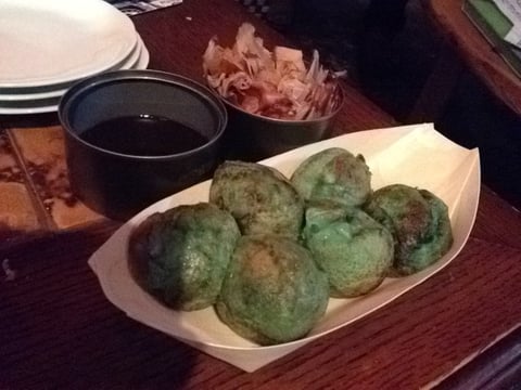 色は食紅でつけてるんですって。「ヨモギとか、ほうれん草で色つけないんですか?」って言ったら、「それ、美味しくないんじゃない?」と周りにつっこまれました。確かにそうかも。食べると、京風の中身がトロッとしたたこ焼きで、こちらも普通に美味しい。変な味ナーシ!